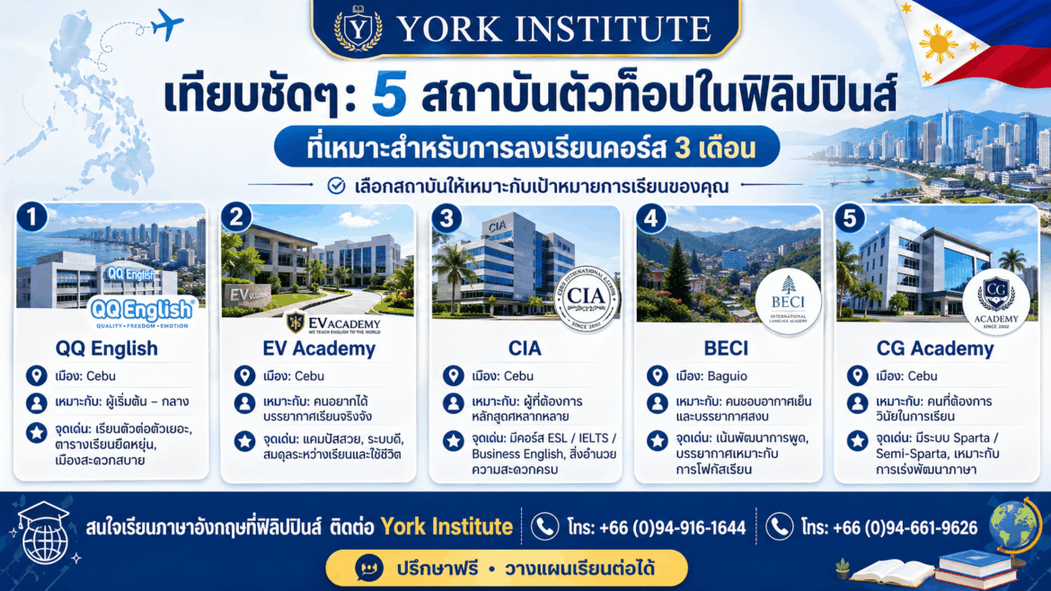 หากคุณต้องการความช่วยเหลือเพิ่มเติมหรือมีคำถามเกี่ยวกับการเดินทางและการเรียนในฟิลิปปินส์ York Institute พร้อมให้บริการคุณอยู่เสมอ. ติดต่อเราได้ที่เบอร์โทร 094-916-1644 หรือ 094-661-9626. หรือสามารถหาเราได้บน Instagram ที่ York_institute Facebook ที่ Yorkinstitute และ Line ID ที่ @York-Institute.